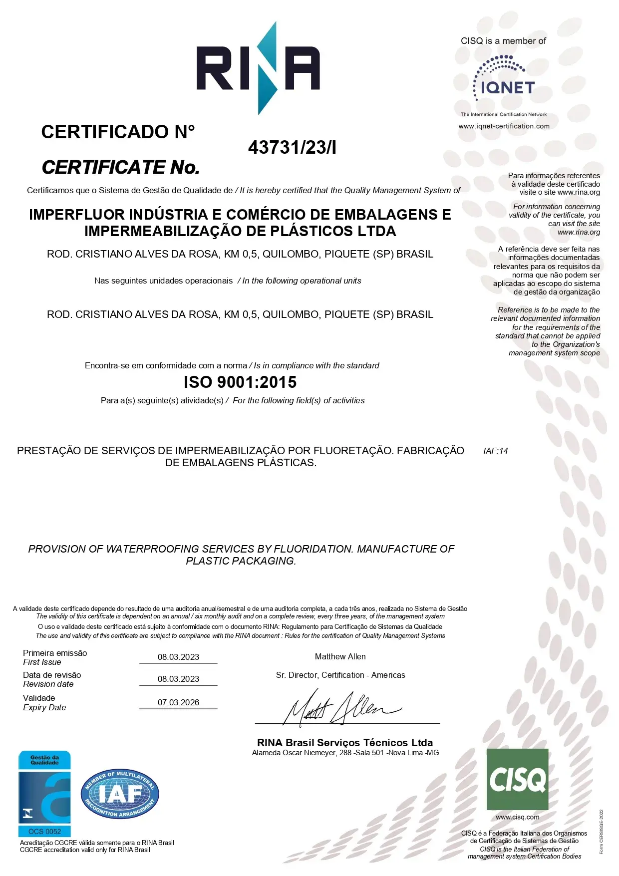 Prestação de serviços de impermeabilização por fluoretação. Fabricação de embalagens plásticas.